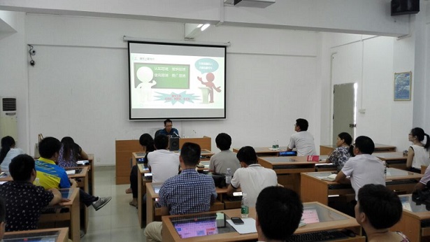 余俊渠主要就開展易班工作的現(xiàn)實意義、學(xué)校層面如何建設(shè)易班、輔導(dǎo)員如何發(fā)揮作用等方面進(jìn)行了精彩講座;麥偉強(qiáng)老師主要介紹了易班的內(nèi)部架構(gòu)和實際操作,主要是公共平臺、公共號、機(jī)構(gòu)群等的功能和具體編輯處理技巧。
