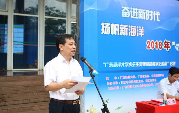 學校黨委副書記向獻兵主持儀式,校長葉春海以及廣東省科協黨組書記何真發表了熱情洋溢的致辭,學生代表宣讀全國海洋科普志愿者招募活動倡議書,何真為我校海洋科普志愿者代表授旗,表彰了12名2017年我校海洋科普優秀志愿者。葉春海宣布廣東海洋大學2018年“世界海洋日暨全國海洋宣傳日” ——“廣東海洋大學水生生物博物館數字化應用”啟動儀式、第五屆“奔向大海 跑向未來”全國涉海高校慢跑公益活動暨全國海洋科普志愿者招募活動正式啟動;啟動儀式結束后,領導、嘉賓和同學們一起參加了簽字留念活動,并一起參觀了我校近年海洋科普成果宣傳欄,同時感受了博物館新的數字化應用及實體館藏間的互動體驗。