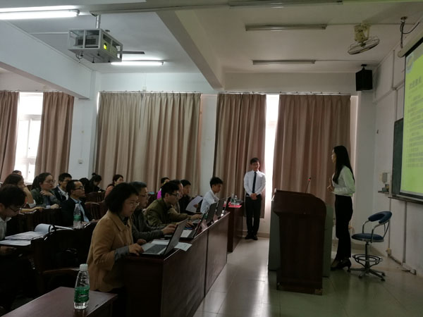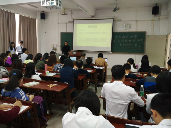 各個團隊通過PPT講演向評委展示自己的研究成果,接受評委的檢驗和提問。評委們結合每件作品的內容和學生的答辯情況,對作品提出了存在的問題和改進的意見。很多團隊答辯完后又悄悄地從教室后門回到座位上,靜觀其他團隊的展示和答辯,認真學習,取長補短,不放過任何學習的機會。參賽的同學都深有體會:終審答辯既是一場比賽,更是一個學習提高的平臺!