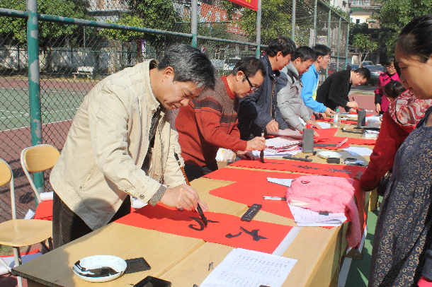 活動邀請了我校愛好書法者譚樹明、栗克元、勞贊、朱偉雄、曾昭茂等現(xiàn)場揮毫、潑墨送福。只見紅幅鋪展,毛毫浸墨,筆鋒婉轉(zhuǎn),一幅幅寄寓美好祝愿的春聯(lián)便躍然紙上,或飄逸娟秀,或遒勁有力,濃濃的情意、真誠的祝福溢于字里行間,既有辭舊迎新、平安吉祥的美好愿景,也有和諧發(fā)展、政通人和的勵志高歌。