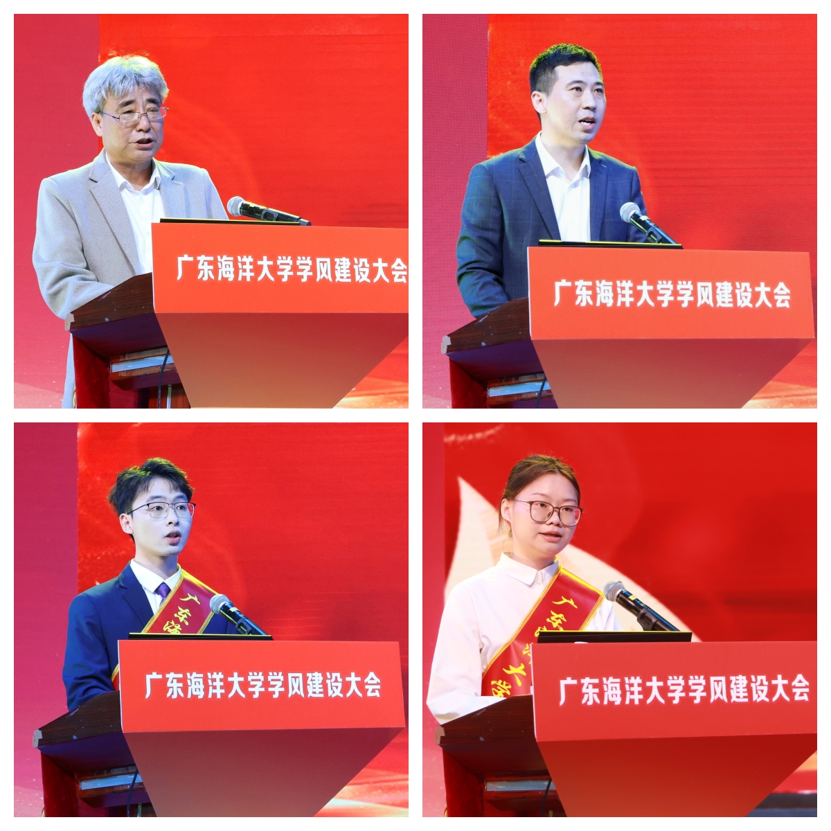 教師代表濱海農業學院趙志輝教授、輔導員代表水產學院朱曉聞老師分別從師德師風、以教風帶學風、輔導員的職責使命、學風建設舉措等方面交流了經驗和感悟。校十佳大學生代表化學與環境學院葉鴻杰、校十佳班集體代表數學與計算機學院何芯儀分別從個人成長經驗、學風傳承、班集體學風建設談起,分享了自己對優良學風的理解與感受。