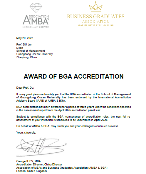 5月20日,學校收到英國商學院畢業生協會(Business Graduates Association,簡稱BGA,全球商學教育三大認證體系之一)發來的官方賀信,祝賀我校管理學院順利通過BGA國際金牌認證,標志著管理學院成為國內海洋類大學首所單獨獲得BGA金牌國際認證的商學院,同時也是我校獲得的首個國際商科認證。