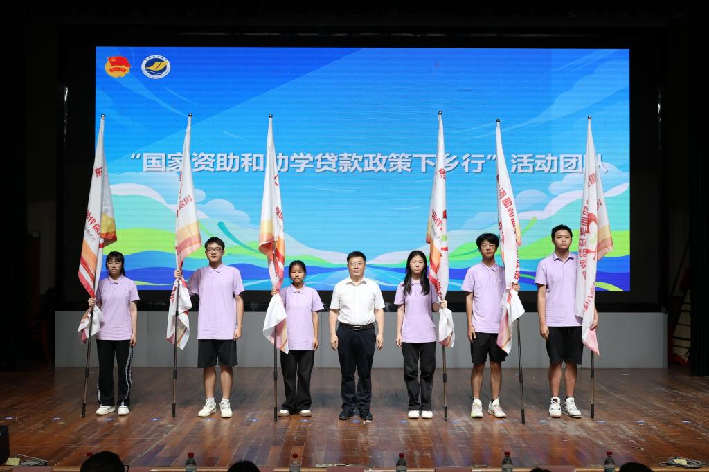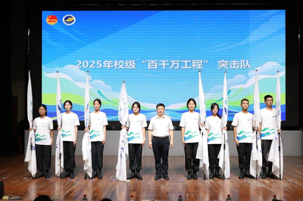 儀式在回顧2024年社會實踐豐碩成果的視頻中拉開序幕。楊洲為2025年出征團(tuán)隊學(xué)生代表授旗。本年度重點組建的“國家資助和助學(xué)貸款政策下鄉(xiāng)行”團(tuán)隊、校級“百千萬工程”突擊隊接過象征使命與擔(dān)當(dāng)?shù)钠鞄茫b待發(fā)。