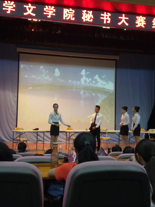 接著,由獲得第六屆全國商務秘書職業技能大賽團體獎一等獎的秘書專業學生何璟、梁佳焰、蘇虹漫、聶啟金四位同學作了關于會議籌備及會務工作相關的秘書實務進行了場景模擬展示;在第四屆廣東省秘書職業技能大賽獲得“秘書工作情景展示”一等獎的周葉欣、廖子惠、趙昕、邱釗城四位同學的展示內容則是秘書該如何處理多頭領導與日常事務等情況。情景展示結束之后八位獲獎同學依次上臺與大家分享了他們在賽前培訓以及賽中表現的一些經驗與心得。
