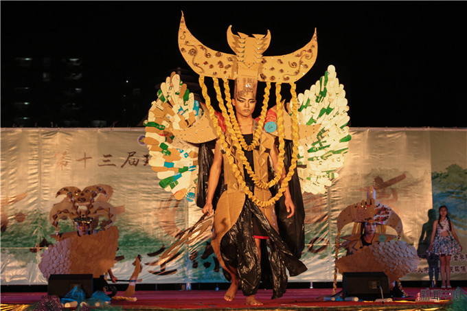 當(dāng)晚,學(xué)子們化身“環(huán)保大使”,身著用舊報紙、紙皮、廢舊雨傘、葉子、麻繩等廢棄素材設(shè)計而成的“時裝”在舞臺上走秀。其中,13級環(huán)藝1班黃英純、麥欣怡和13級環(huán)藝3班溫鈺儀合作設(shè)計的39號作品《漠煙如織》僅用黑色塑料袋為材料,通過精巧的剪裁制作成能勾勒女生曼妙的身姿晚禮服,并采用金粉映襯鏤空后背,其簡潔卻大氣的設(shè)計令人叫絕。14級環(huán)藝4班曾金權(quán)、梁德宏、黃浩共同創(chuàng)作的60號作品《原色》用廢舊的紙皮拼接成夸張的頭飾和服裝,其古埃及的風(fēng)格讓作品顯得神秘而大氣。“年輕人就是要敢想敢做敢創(chuàng)新!”設(shè)計者表示,他想在作品中傳達(dá)一種敢于嘗試的精神,其材料來源是日常收快遞后的廢棄紙皮箱。他還介紹道,噴漆本就是一種不環(huán)保行為,所以他的作品采用原木色。14級服設(shè)1班廖婉君的58號作品《軟與硬》的設(shè)計靈感來源于結(jié)構(gòu)設(shè)計課程作業(yè)。設(shè)計者用經(jīng)過修剪的千層衣領(lǐng)配合貝殼裝飾,使整個設(shè)計富有層次感,其設(shè)計理念中把“軟”與“硬”完美結(jié)合的構(gòu)思獲得評委的一致贊許,奪下本場決賽的一等獎。
