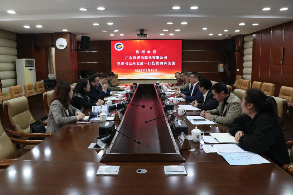 3月18日下午,廣東教育出版社有限公司黨委書記朱文清一行到我校座談交流。學校黨委常委、副校長譚北平會見了朱文清一行并主持座談會。宣傳統戰部、學生工作部、教務部、科學技術部、國際交流合作部、學報編輯部、現代教育技術中心等部門相關負責人參加座談會。