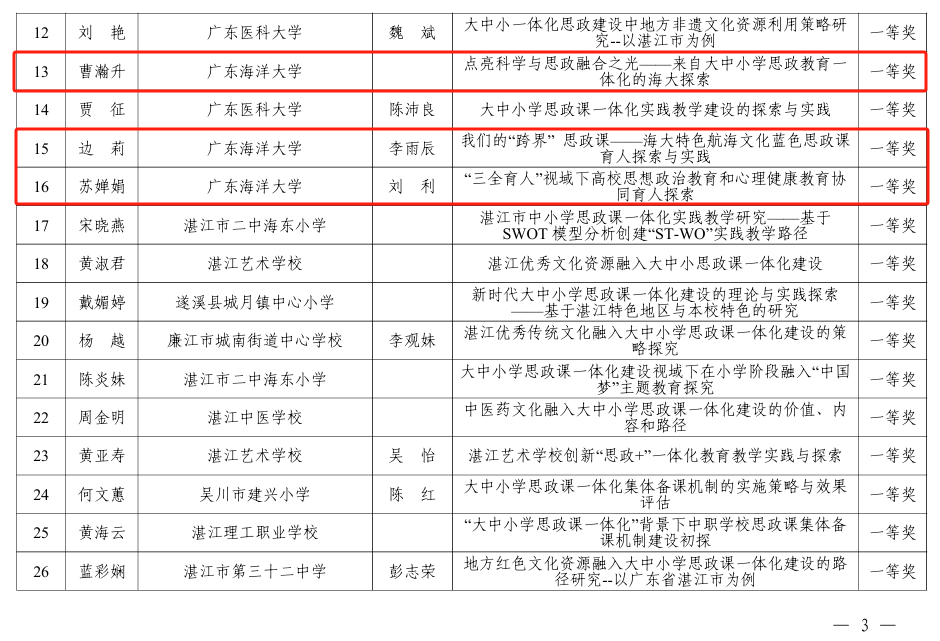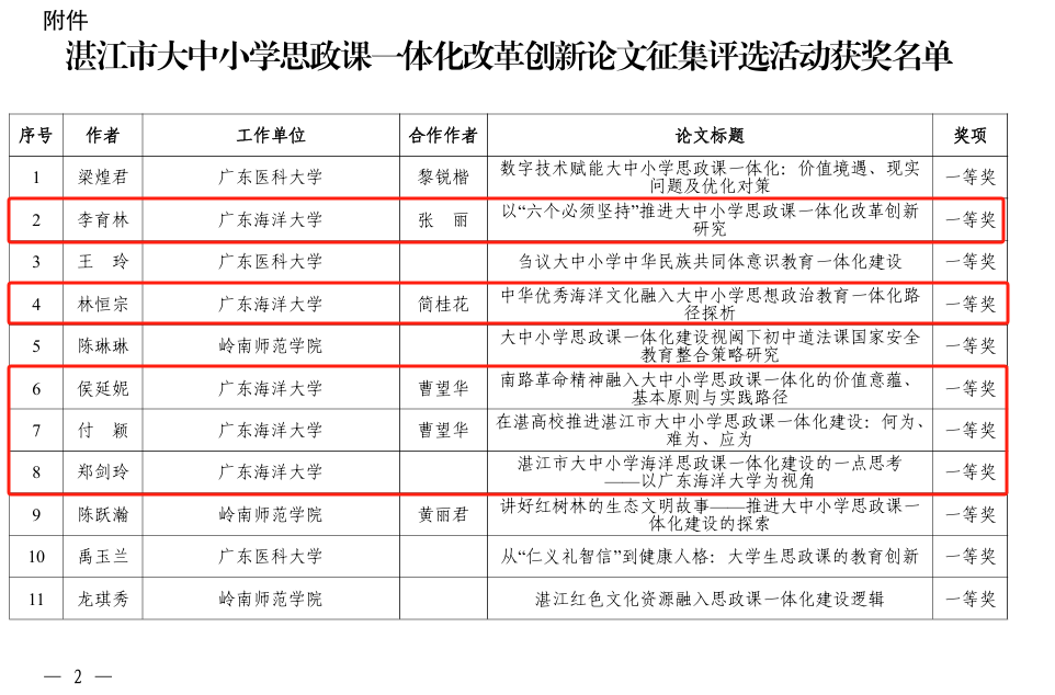 近日,湛江市教育局公布了關(guān)于湛江市大中小學(xué)思政課一體化改革創(chuàng)新論文征集評(píng)選活動(dòng)結(jié)果,我校師生在評(píng)選中表現(xiàn)突出,共有8篇論文榮獲一等獎(jiǎng)。此次評(píng)選活動(dòng)中,我校獲一等獎(jiǎng)的論文數(shù)量位居全市首位,充分展現(xiàn)了學(xué)校在推進(jìn)大中小學(xué)思政課一體化建設(shè)領(lǐng)域的扎實(shí)研究與實(shí)踐成果。