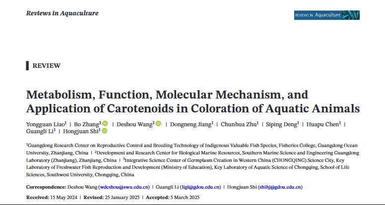 近日,水產學院魚類遺傳育種與增養殖團隊在水產養殖領域國際頂級學術期刊Reviews in Aquaculture(中科院1區Top,Q1,5 year IF=9.64)上發表了題為《Metabolism,Function, Molecular Mechanism,and Application of Carotenoids in Coloration of Aquatic Animals》的綜述論文。