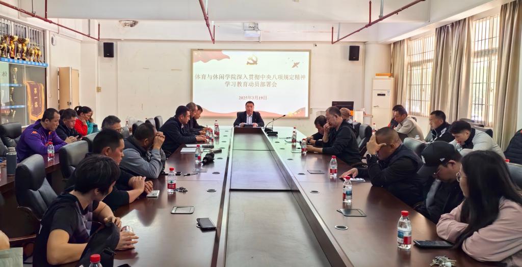 為深入貫徹落實中央八項規定精神,進一步推動全面從嚴治黨向縱深發展,體育與休閑學院于3月19日在體育館會議室召開深入貫徹中央八項規定精神學習教育動員部署會。學院黨委書記王明對主持會議并作動員講話,學院全體教職工參加會議。