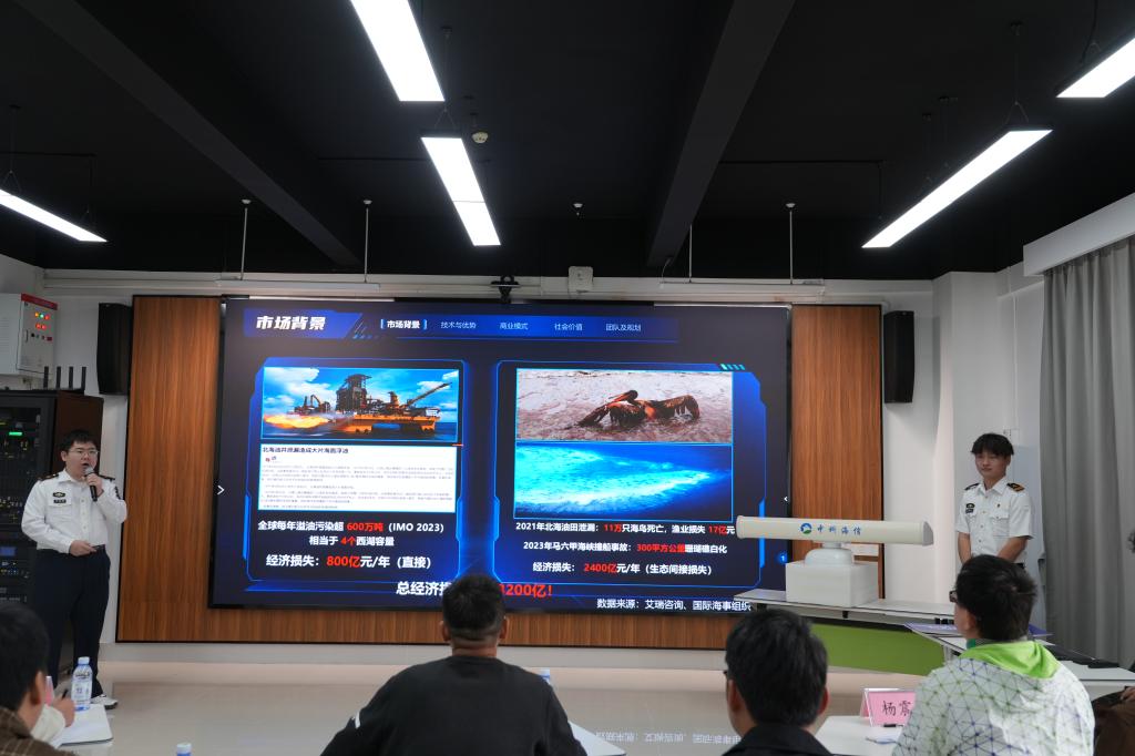 4月2日,訓練營迎來第三階段的成果匯報展示環節。廣學先鋒營的10支項目團隊在海創樓304室進行了成果匯報。匯報采用“7+3”模式,項目團隊通過PPT演示、項目陳述和現場答辯對項目成果進行全面展示。評審團根據項目展示和現場答辯情況進行打分。最終,《“漁”水情深-助力現代化海洋牧場建設》項目以第一名的成績直通2025年中國國際大學生創新大賽校級復賽。