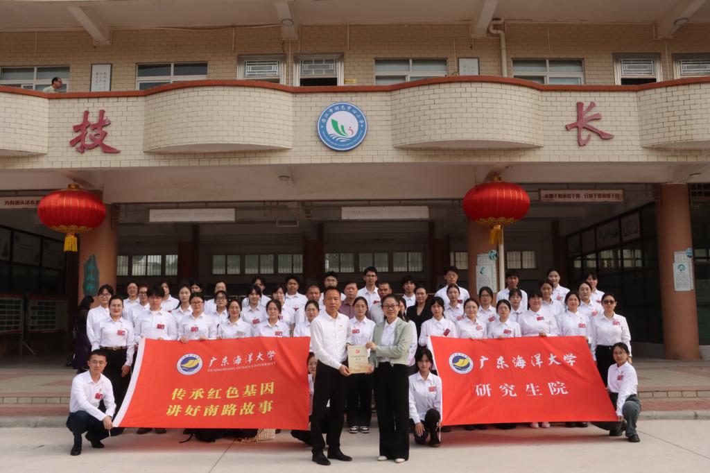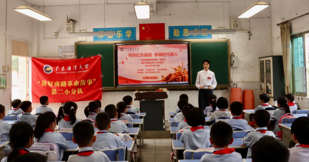 作為學校構建“紅藍綠”大思政育人格局中“以紅色基因打底色”的重要內容,“講好南路革命故事”既是擦亮黨建特色的品牌工程,更是通過革命敘事啟智潤心、培根鑄魂的育人實踐。活動中,陳關怡代表宣講團向湖光中心小學贈送《講好南路革命故事讀本》,為紅色教育注入鮮活教材。42名大學生宣講員構建“多維宣講矩陣”,依托革命文物圖片、情景演說、互動問答等形式,在36個班級同步開講南路革命先驅黃學增、南路“江姐”鐘竹筠等南路革命先輩的革命理想、家國情懷等史詩般的故事。通過“行走的紅色課堂”,將“南路星火”化作可觸可感的成長養分。
