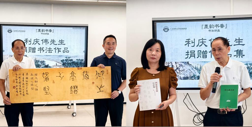 活動伊始,麥冬寧向到場嘉賓和師生致以熱烈歡迎與誠摯感謝,并表示書法是中華優(yōu)秀傳統(tǒng)文化的璀璨瑰寶,歷經千年歲月沉淀,承載著民族的精神基因,希望大家在講座中認真聆聽、深入感悟,領略書法藝術的獨特魅力。隨后,麥冬寧代表校區(qū)接收利慶偉捐贈的單幅書法作品,李中代表校區(qū)接收利慶偉捐贈的書法作品集《綠水源詩話》和《國展精英榜·利慶偉》。