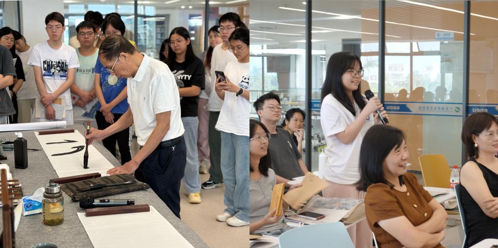 講座上,利慶偉以“生活視野下書法筆法探究”為主題,從音樂、美術、舞蹈、道德修養(yǎng)和教育等方面多維詮釋書法與日常生活的聯(lián)系,并講解了書法的八種筆法;示范環(huán)節(jié),利慶偉現場揮毫并指導師生書寫,細致解析并演示不同筆法的運筆技巧,大家圍案觀摩,踴躍提問,氛圍熱烈,墨香四溢。
