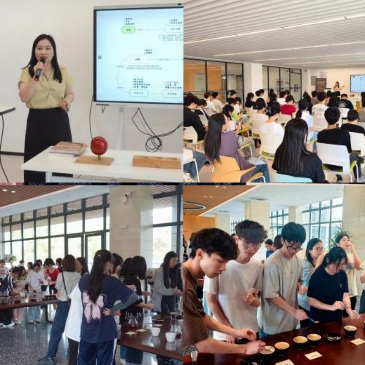 本次沙龍活動分為咖啡知識講座和品鑒體驗兩大環節。在講座環節,吳水玲以《咖啡世界地圖》一書為引,從咖啡的“前臺”“中臺”“后臺”三大產業鏈為框架,為師生解碼了咖啡的種植、咖啡生豆的處理、咖啡烘焙、咖啡沖煮的全流程工藝,為大家揭開了咖啡豆從種子到杯子的蛻變歷程。在品鑒體驗環節,吳水玲帶領師生實地參觀了商學院百瑞斯塔咖啡實驗室,并請大家對學生助理制作的19種不同風味的咖啡飲品進行杯測,通過近距離觀察、聞香和品鑒,感受從鼻尖到味蕾的層次變化,讓大家對咖啡的不同風味有了更直觀的認識。活動現場,悠揚的鋼琴聲與咖啡的醇香、書香相互交融,大家在品嘗咖啡的同時熱烈交流,師生同樂,其樂融融。