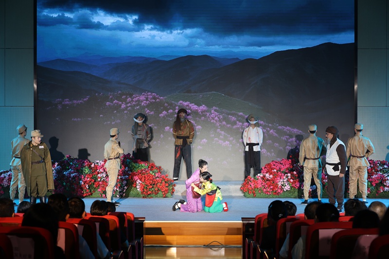 《黨的女兒》以1935年江西蘇區為背景,講述了女共產黨員田玉梅死里逃生后,依然堅守信仰、帶領群眾與敵人頑強斗爭,最終為革命事業英勇獻身的感人故事。中歌藝術學院高鯤、張春雨、陳佳、王晟祖等七位主要演員聯袂出演,配合表演系、舞蹈編導、音樂系數十名師生,以藝術形式詮釋了“黨的女兒”對黨忠誠、舍生取義的崇高精神。舞臺上,杜鵑坡的硝煙與血色交織,劇情在演員們極具張力的表演中層層推進。表演尾聲中漫山“杜鵑花”在投影中絢爛綻放的意象設計,象征著革命精神的永恒傳承。