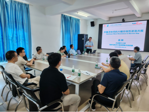 呂林針對大型深海浮式液化天然氣平臺(FLNG)與液化天然氣運(yùn)輸船(LNGC)的近距靠泊裝/卸載作業(yè)問題,作了題為《并靠浮體間的大幅非線性波浪共振》的學(xué)術(shù)報(bào)告。報(bào)告內(nèi)容涉及浮體間大幅波浪共振的阻尼耗散機(jī)理與改進(jìn)勢流分析方法、考慮浮體運(yùn)動(dòng)響應(yīng)的耦合共振特性、大幅波浪共振的非線性作用機(jī)制,以及浮體間三維多模態(tài)共振響應(yīng)特征等四個(gè)方面。呂林詳細(xì)解答了師生的提問,并針對實(shí)驗(yàn)技術(shù)和計(jì)算分析方法等進(jìn)行了深入的討論。