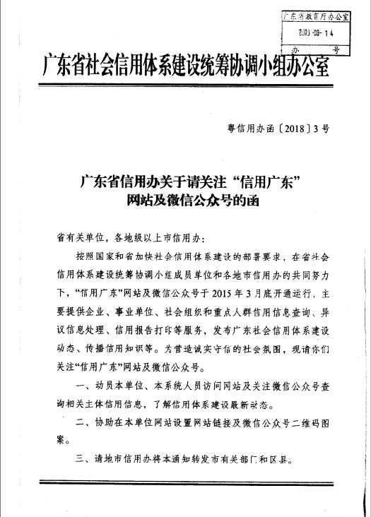 關于轉發廣東省信用辦關于請關注“信用廣東”網站及微信公眾號的函