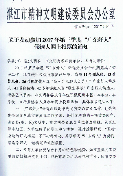 轉發《關于發動參加2017年第三季度“廣東好人”候選人網上投票》的通知