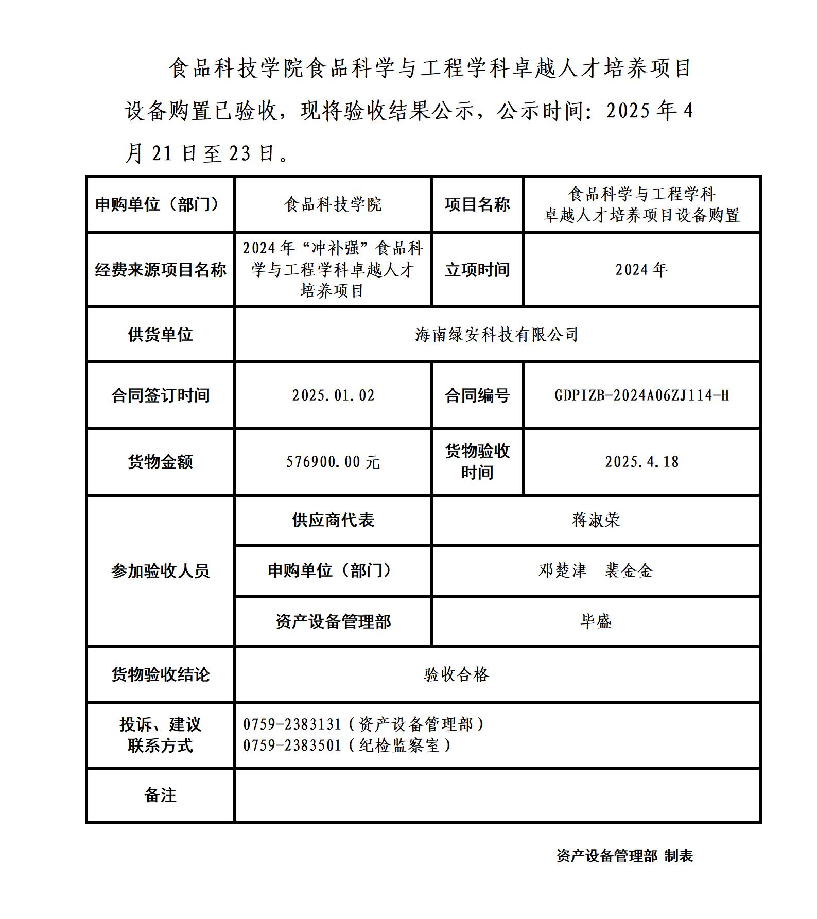 食品科技學(xué)院食品科學(xué)與工程學(xué)科卓越人才培養(yǎng)項(xiàng)目設(shè)備購置驗(yàn)收公示