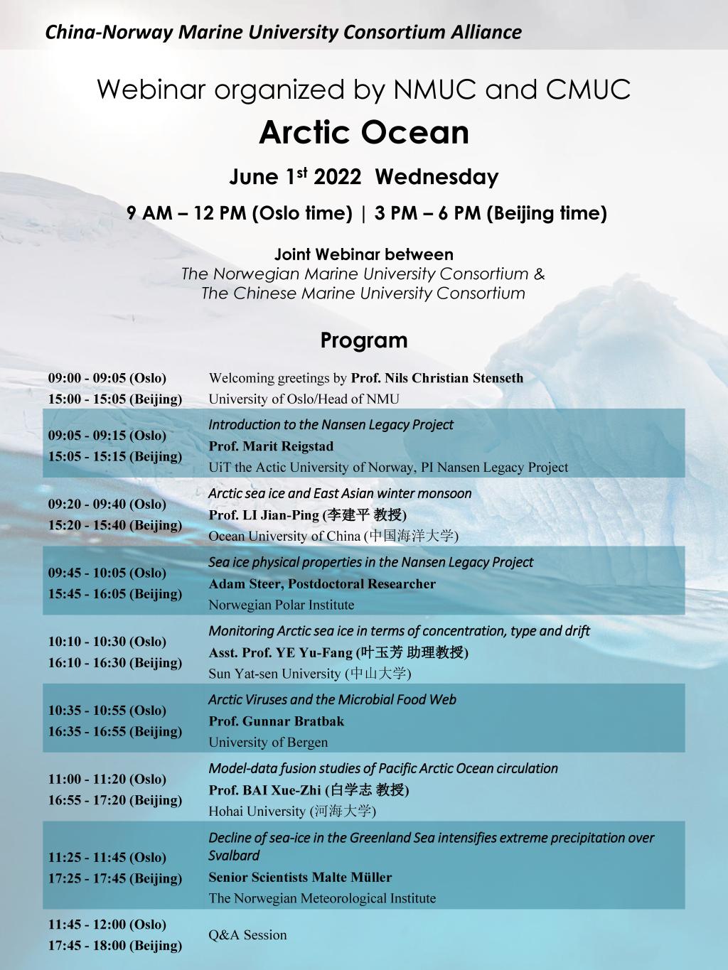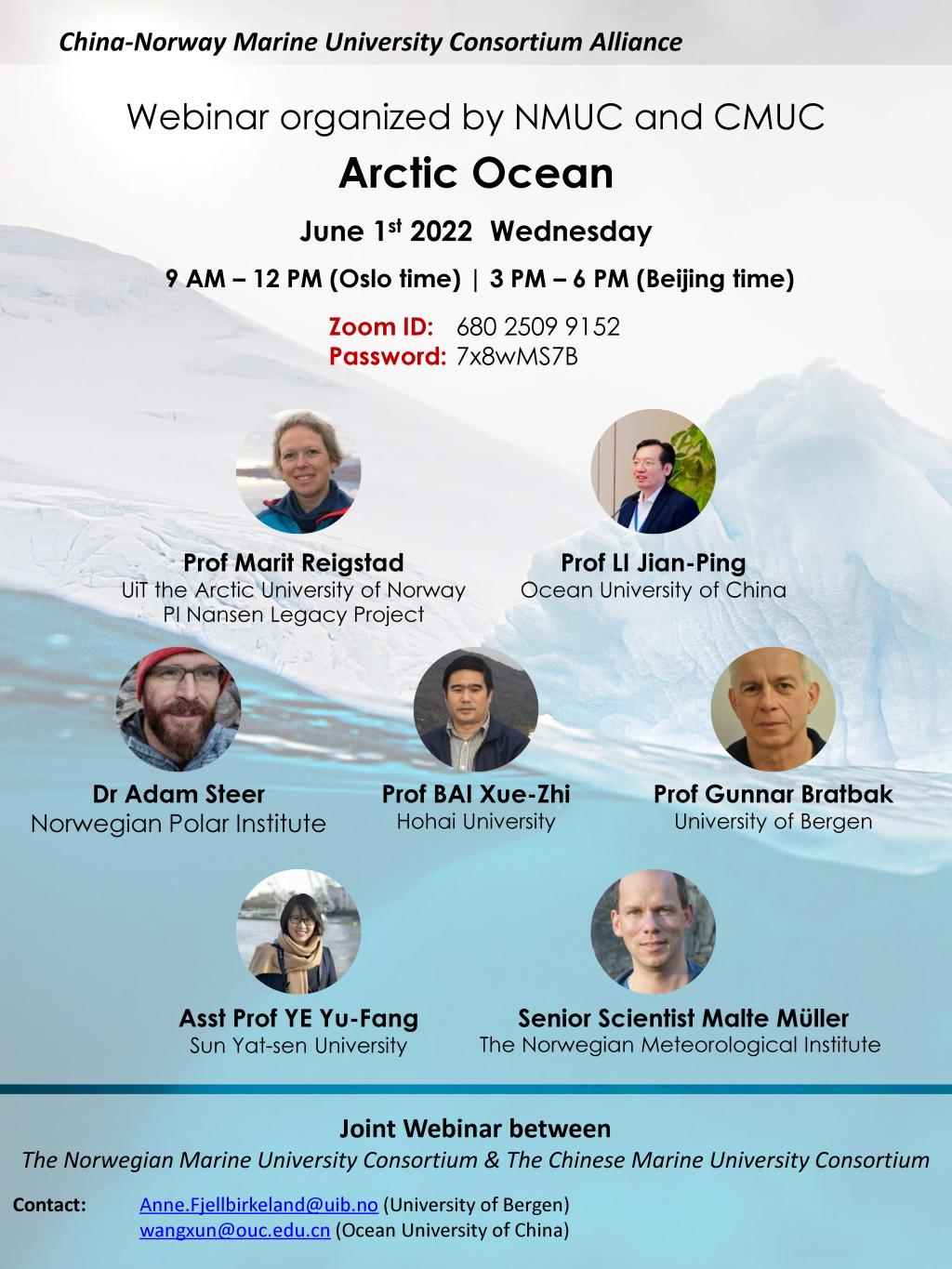 中挪海洋大學聯盟將于北京時間6月1日15:00-18:00舉辦第一次主題線上研討會: Arctic Ocean,歡迎各位老師踴躍參加!