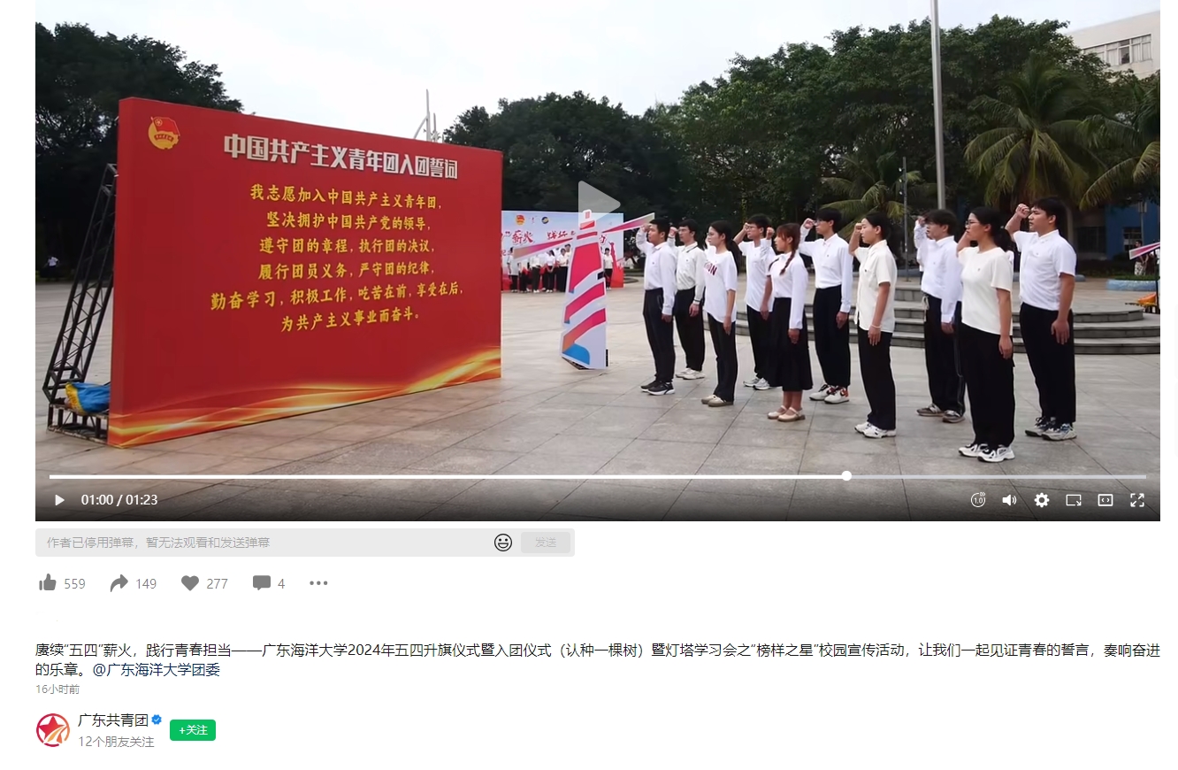 5月6日,廣東共青團(tuán)官方視頻號(hào)刊播視頻,展示了我校2024年五四升旗儀式暨入團(tuán)儀式(認(rèn)種一棵樹(shù))暨燈塔學(xué)習(xí)會(huì)之“榜樣之星”校園宣傳活動(dòng)。