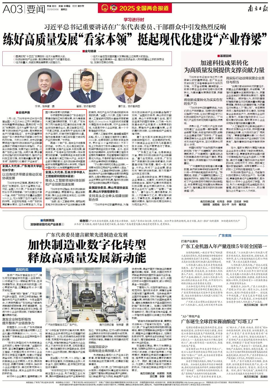 習近平總書記強調,圓滿實現“十四五”發展目標,經濟大省要挑大梁。對此,全國人大代表、廣東海洋大學副校長寧凌深有感觸:“作為我國經濟第一大省,去年廣東的經濟總量占全國的10%以上,充分發揮了經濟大省挑大梁的作用。我堅定地相信,今年廣東的發展前景會更好,經濟會更有活力,對全國大局會有更大的貢獻。”