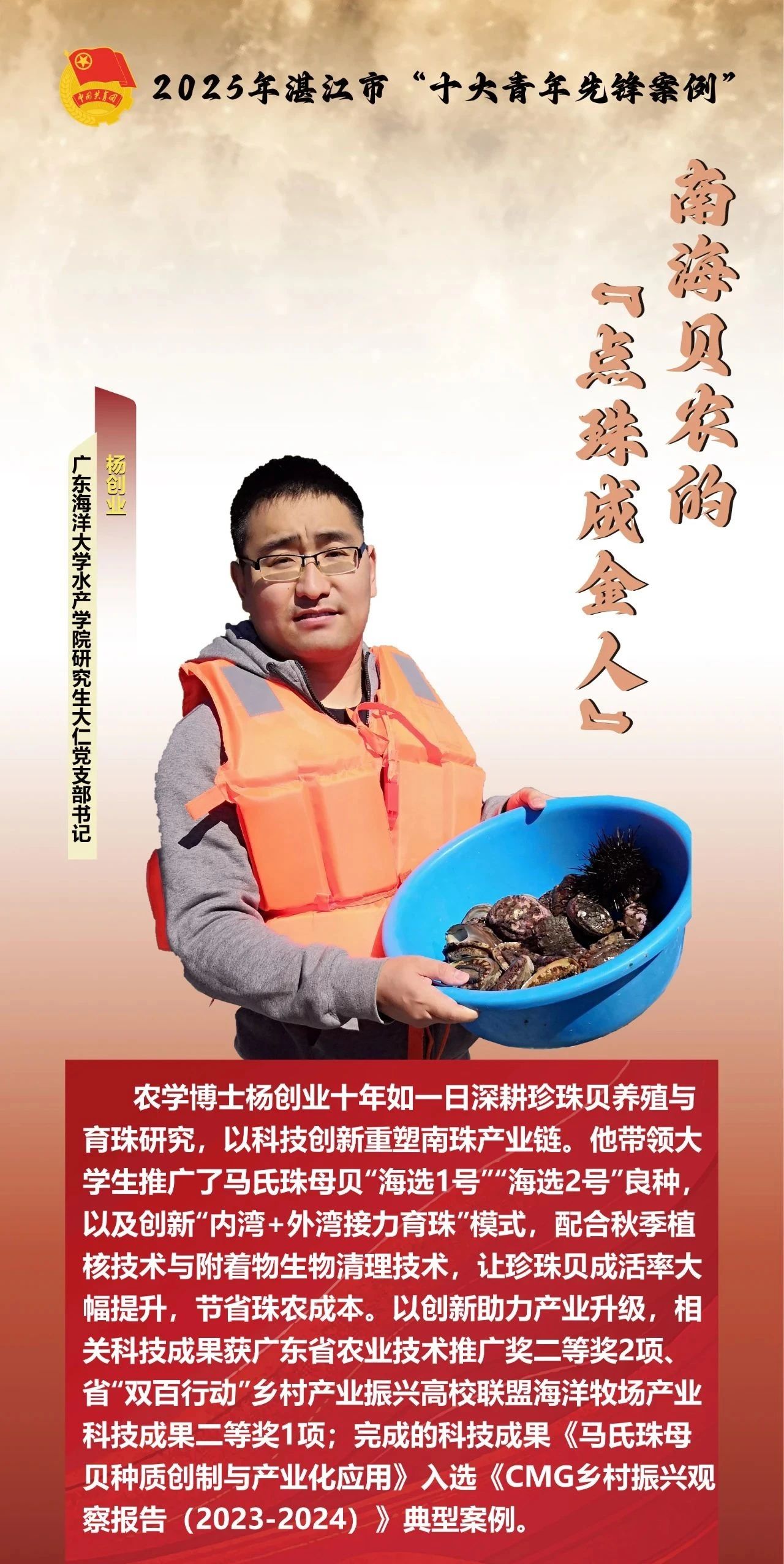近日,共青團湛江市委員會公布2025年湛江市“十大青年先鋒案例”評選結果。我校水產學院青年教師楊創業副教授憑借十年如一日深耕珍珠貝養殖與育珠研究的貢獻,以及在科技創新助力鄉村產業振興中的生動實踐,成功入選該榜單。