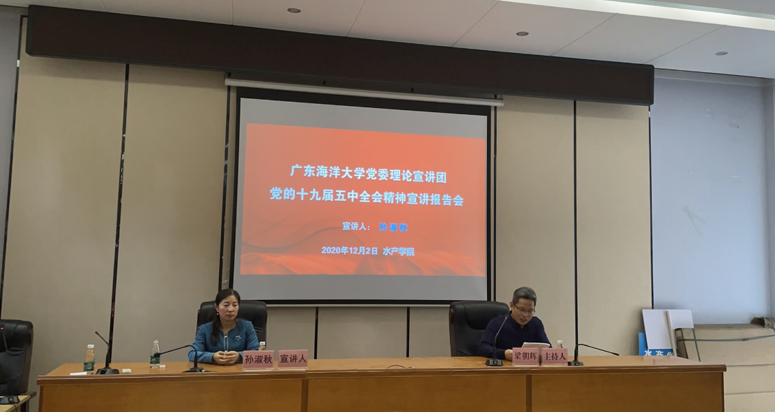 12月2日下午,水產學院在湖光校區水產樓109室舉行學校黨委理論宣講團“四史”知識學習及黨的十九屆五中全會精神宣講報告會,學校黨委理論宣講團成員、馬克思主義學院孫淑秋副教授作專題輔導報告。學院黨委書記梁朝輝主持報告會,水產學院、珍珠研究所、省實驗室建設辦全體教職工參加宣講報告會。