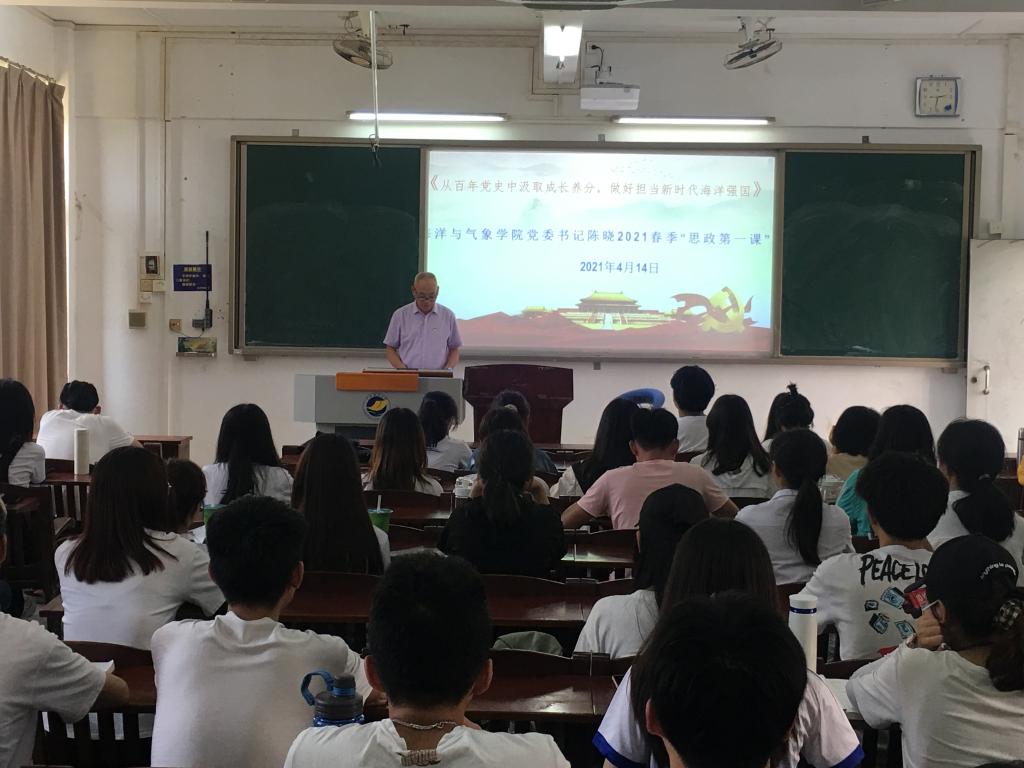 4月14日下午,學(xué)院黨委書記陳曉在湖光校區(qū)鐘海樓開講2021年春季學(xué)期黨委書記“思政第一課”,他以“從百年黨史中汲取成長養(yǎng)分,做好擔(dān)當(dāng)新時代海洋強國使命”為題講授了一堂生動的黨史學(xué)習(xí)教育課。學(xué)院學(xué)生黨員、青馬班同學(xué)80余人參加。