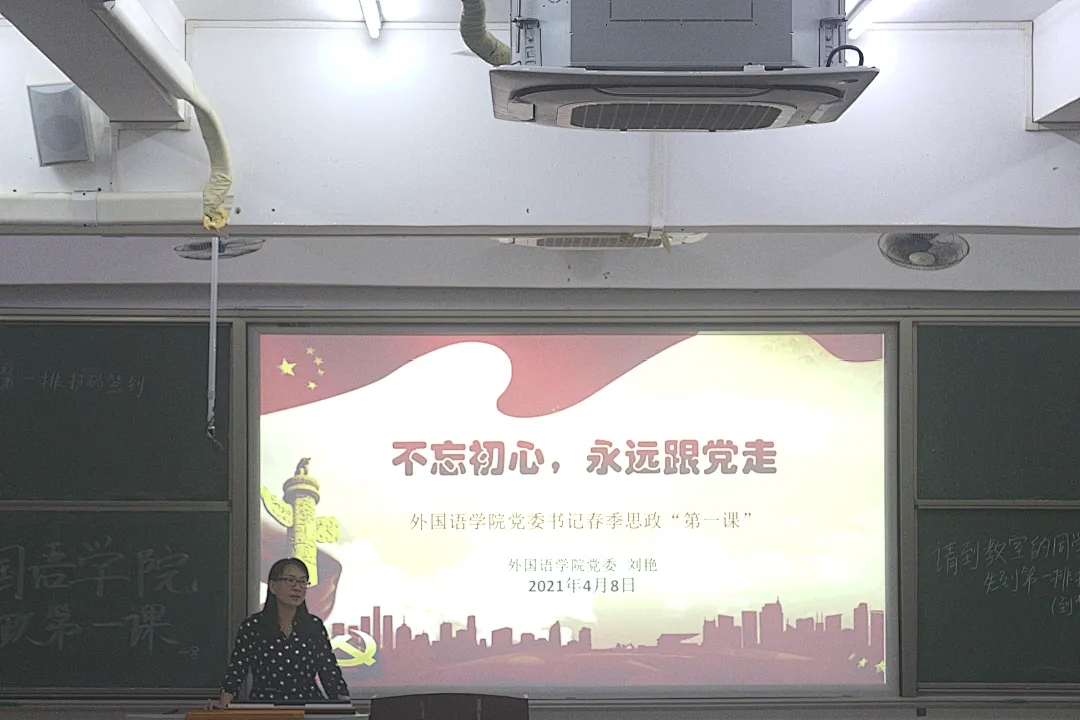 4月8日晚上,外國語學院正處級輔導員、黨委副書記劉艷在鐘海樓04024為學院2019級學生講授了題為《不忘初心,永遠跟黨走》的“思政第一課”。課程緊緊圍繞習近平新時代中國特色社會主義思想,引導廣大青年學生正確了解黨史、國史,增強“四個意識”,堅定“四個自信”,做到“兩個維護”,自覺擔負起新時代的青年使命,為實現“兩個一百年”奮斗目標、實現中華民族偉大復興中國夢而努力奮斗。