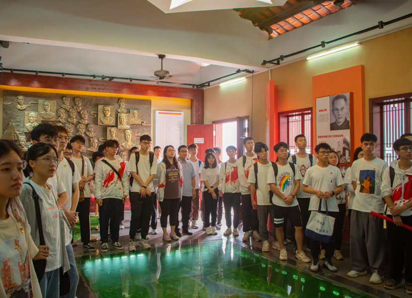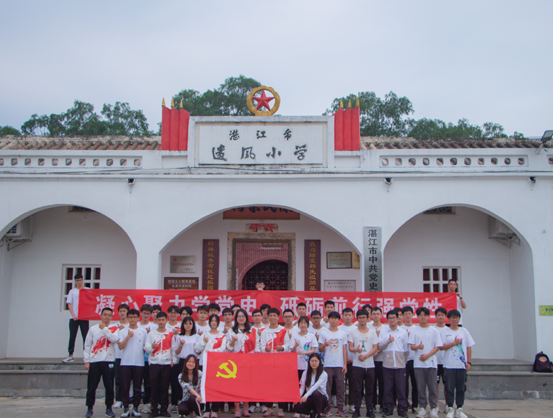 在遺風小學中共廣東南路特委舊址,學生黨員通過聆聽講解員聲情并茂的講解、觀看影像視頻、參觀歷史圖片和文物,了解了南路革命艱苦卓絕的斗爭歷程,被黃景文等革命先烈可歌可泣的英雄事跡所感動,更被他們英勇無畏的革命精神所感染。在遺址僅有的一間只能容納30人的課室里,物理系學生黨支部書記劉育廷老師給學生黨員上了一堂以“學黨史、強黨性、跟黨走”為主題的黨課,她希望黨員同志們在黨史學習中要學史明理、學史增信、學史崇德、學史力行,不斷增強黨性修養,做共產主義理想信念的堅定踐行者。隨后,在支部書記的帶領下,全體黨員在舊址高高飄揚的石碑黨旗前重溫了入黨誓詞,鏗鏘有力的宣誓聲響徹現場。