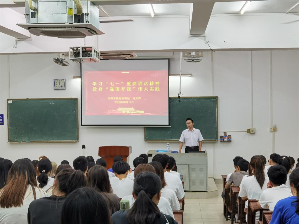10月11日晚,經濟學院黨委書記肖文輝、院長居占杰分別在鐘海樓和主樓教室面向學院本科生講授2021年秋季學期“思政第一課”。