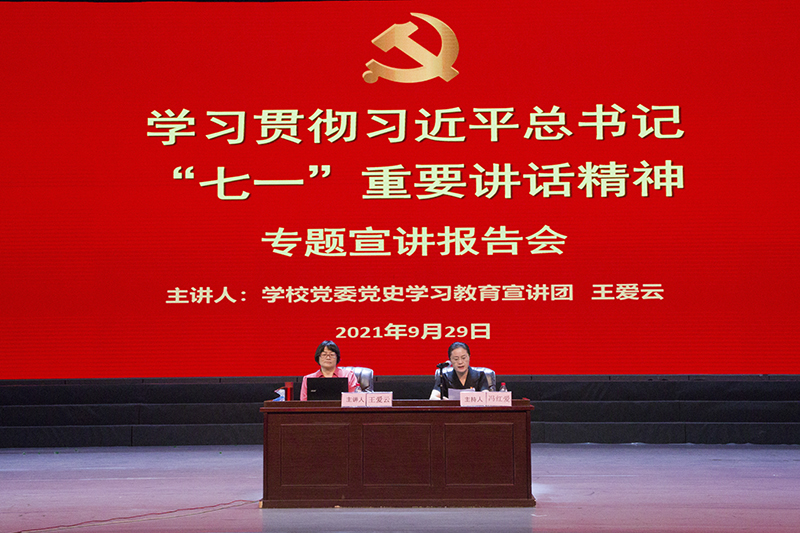 9月29日下午,中歌藝術(shù)學(xué)院在實(shí)驗(yàn)劇場舉行學(xué)習(xí)貫徹習(xí)近平總書記“七一”重要講話精神專題宣講報告會,全體教職工和學(xué)生黨員共200余人參加學(xué)習(xí)。報告會由學(xué)校黨委黨史學(xué)習(xí)教育宣講團(tuán)成員、馬克思主義學(xué)院王愛云教授主講,學(xué)院黨委書記馮紅愛主持。