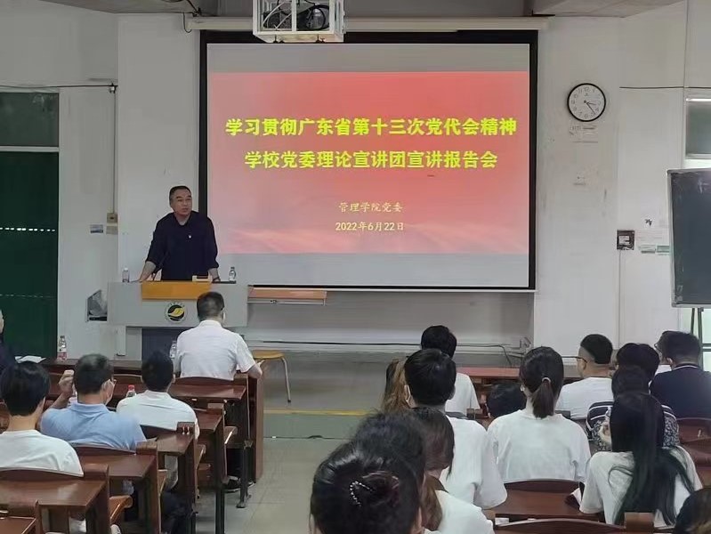 6月22日下午,管理學院在湖光校區教學主樓231室召開學習貫徹廣東省第十三次黨代會精神宣講報告會,由學校黨委理論宣講團成員李林杰博士主講,學院黨委書記李育芳主持會議,全院師生黨員共約150人參加。