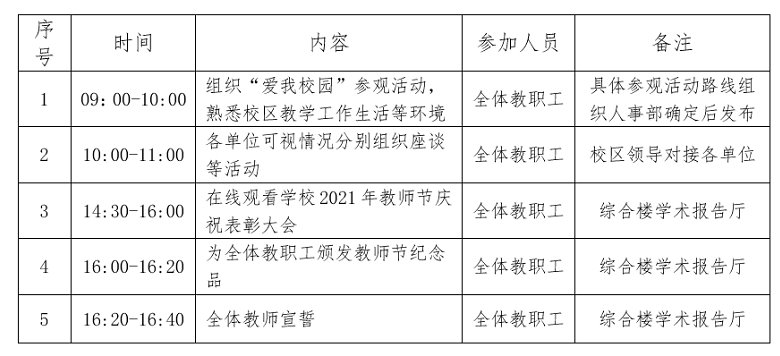 為進一步加強教師隊伍建設,鼓勵教職工做師德高尚、敬業愛崗、樂于奉獻的新時代高校教師,不忘初心、凝心聚力,經校區管委會研究決定,結合《廣東海洋大學2021年教師節慶祝表彰大會工作方案》,定于9月10日組織全體教職工開展陽江校區首屆教師節慶祝活動,現將活動安排通知如下: