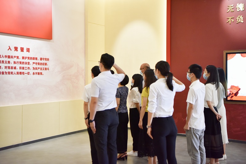 在解說員的帶領下,全體黨員參觀了邊海紅色展館展示區域,重溫紅色歷史,了解“邊海紅旗精神”。在入黨誓詞展示墻前,許浩同志擔任領誓人,全體黨員舉起右拳,一同重溫入黨誓詞。