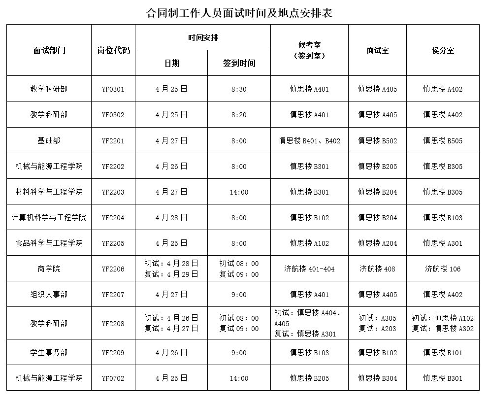 現將4月25日至29日陽江校區合同制工作人員面試考場安排通知如下,請按照以下時間準時到達陽江校區(江城區白沙街道羅琴路1號),按以下地點到位。