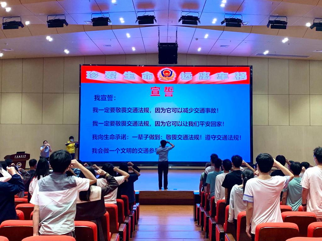 最后,敖警官帶領(lǐng)在場(chǎng)的同學(xué)們進(jìn)行宣誓,要求每一位同學(xué)都應(yīng)當(dāng)敬畏交通法規(guī),遵守交通法規(guī),在日常生活中做一個(gè)文明的交通參與者。