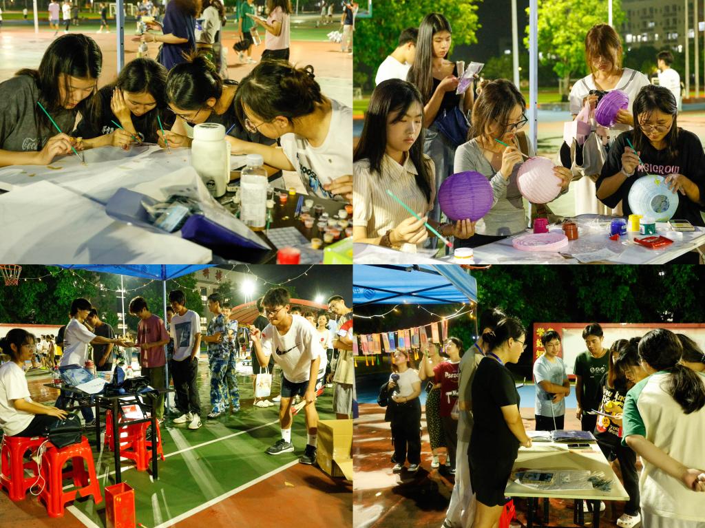 活動當晚,現場彩燈高掛,花燈點綴,營造出濃厚的節日氛圍。本次中秋游園會共設五個活動區,包括“謎韻中秋”猜燈謎區、“壺中映月”投壺區、燈籠繪制區、剪紙體驗區、共繪油畫區等。同學們在各活動區來回穿梭,近距離感受中國傳統節日的魅力。