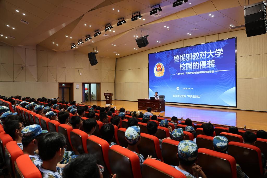 在反邪教專題教育活動上,陽江市公安局“平安宣講隊”民警通過對反邪教知識的科普講解、現實案例展示、觀看警示教育片等形式進行了宣講,讓同學們認清了邪教的本質和危害,切實提升了識別和抵御邪教的意識和能力;為提高新生對詐騙犯罪的認識和防范意識,組織開展了反詐騙專題教育。“沒有國防就沒有國家的安全,沒有國家的安全,人民的生命就沒有保障”,陽江軍分區政治工作處專家從國際戰略形勢分析、團結斗爭奮力實現中華民族偉大復興等方面為同學們上了一堂精彩的國防安全教育講座,培養了學生的愛國情懷,提升了國防意識,增強了維護國家安全的責任感和使命感。