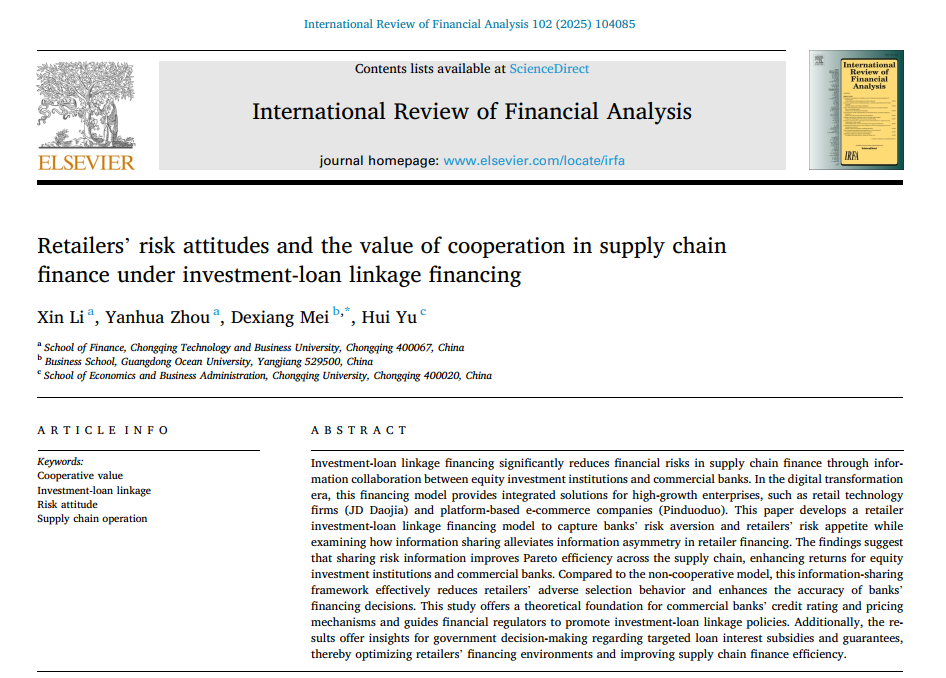 陽江校區商學院經濟學專業梅德祥教授近期以通訊作者身份在國際金融領域頂級期刊《International Review of Financial Analysis》(簡稱IRFA)發表題為“Retailers' risk attitudes and the value of cooperation in supply chain finance under investment-loan linkage financing”高水平學術論文。IRFA是金融學領域國際公認的重要期刊,旨在發表金融與公司財務等領域的高質量理論與實證論文,是JCR經濟學一區,財政與金融類Top期刊,2023-2024年影響因子7.5,五年影響因子7.7。這也是我校首位學者在該期刊發表高水平學術論文。