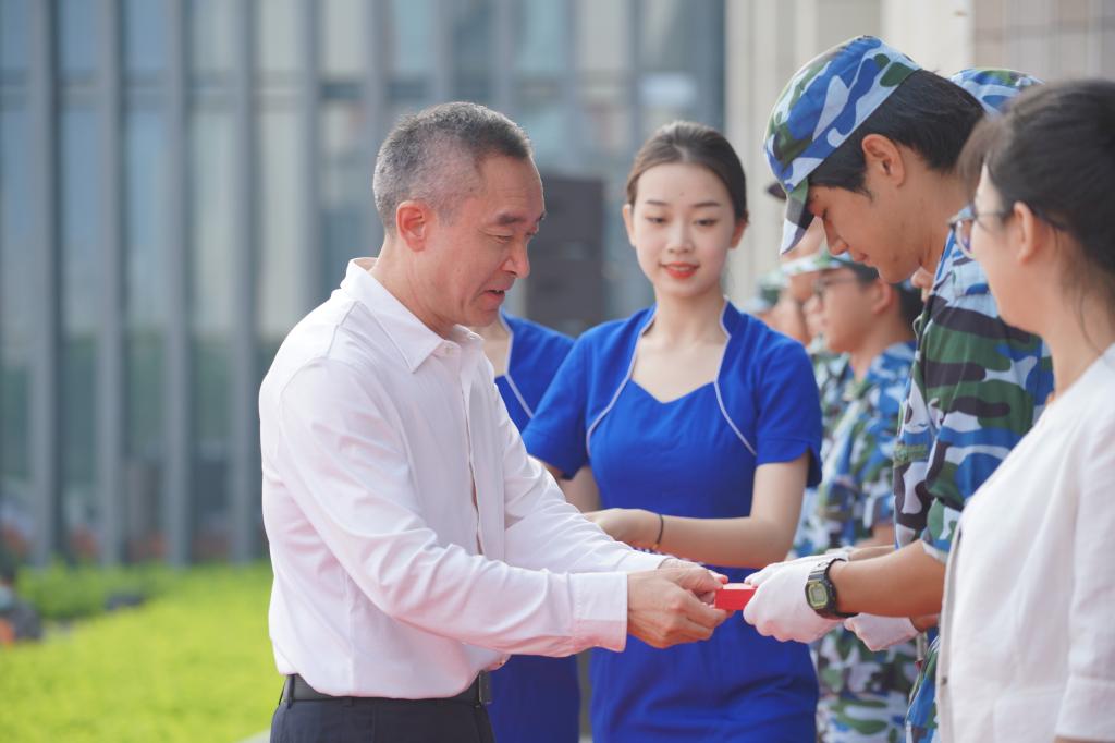 黨委書記曹俊明為新生代表頒發(fā)校徽