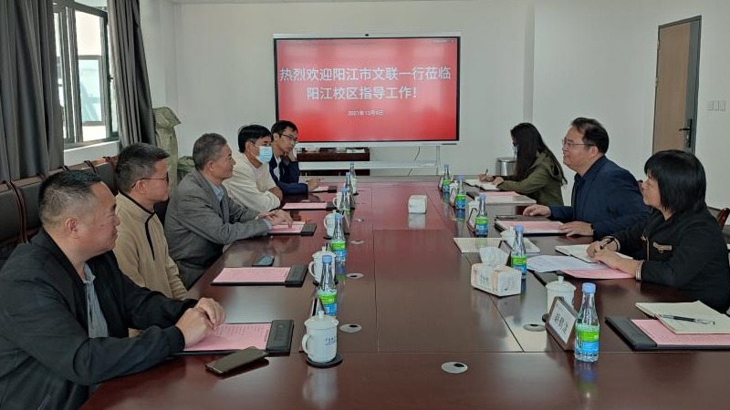 12月9日上午,陽江市文聯專職副主席肖順發,陽江市文聯副主席、陽江書畫院院長曾紀升一行5人來校參觀并在海納樓745開展交流座談。座談會由校區黨委委員、管委會副主任陳永強主持,學生事務部全體成員參加了會議。
