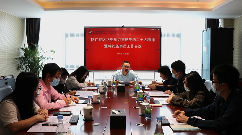 11月9日下午,陽江校區黨委委員、紀委書記毛琪在校區海納樓711會議室主持召開會議,專題學習貫徹黨的二十大精神。學校紀委委員、陽江校區學生事務部第一負責人鄧朝暉以及校區全體特約監察員參加會議。