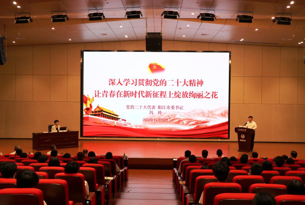 馮玲首先來到陽江校區心理健康教育與咨詢中心,詳細了解校區意識形態和心理健康教育工作情況,要求全面落實意識形態工作責任制,高度重視學生心理健康教育,優化相關基礎設施功能設計。隨后,馮玲以《深入學習貫徹黨的二十大精神,讓青春在新時代新征程上綻放絢麗之花》為題,為師生代表宣講黨的二十大精神并講授思想政治理論課,她結合自己作為黨的二十大代表在北京參會履職的所見所聞、所思所悟,引用古今中外詳實的數據、圖文和視頻等素材,生動講述了黨的二十大盛況、重大意義和精神實質,并結合陽江實際對推動黨的二十大精神落地落實提出了明確要求。