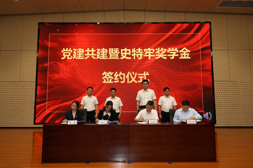 在黨建共建暨獎學金捐贈簽約儀式中,史特牢吳慧書記與學院周榮偉書記簽訂“黨建共建協議”,熊業軍總經理和陳揚枝院長簽訂“史特牢--海上風電獎學金”協議書,丁永成、翁江峰、王春強和白浚宇進行見證。