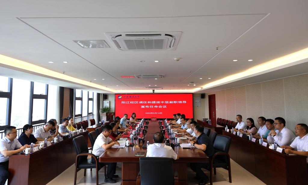 5月16日上午,陽江校區在海納樓712室召開領導干部會議,宣布校區新調任和提拔中層副職領導的任職決定。學校黨委常委、副校長、陽江校區黨委書記、管理辦公室主任周昌仕,陽江校區黨委副書記丁永成、陳永強出席會議,校區各學院、各職能部門以及圖書館領導參會。