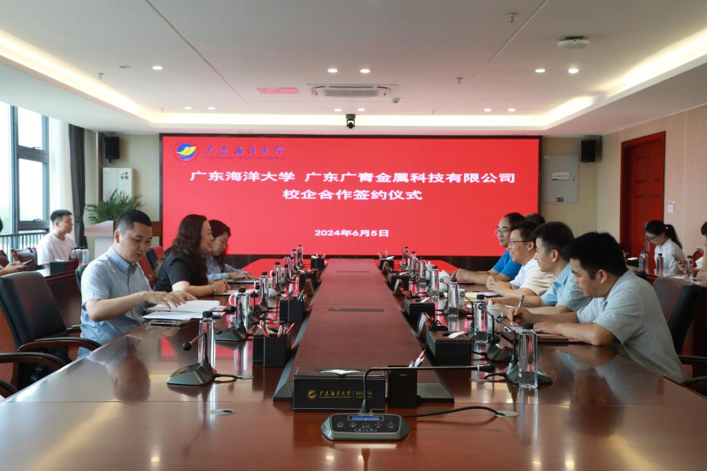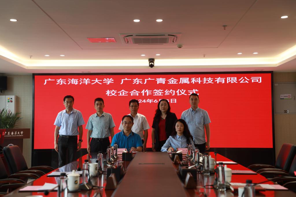 師文慶代表學校,張藝玲代表廣東廣青金屬科技有限公司簽署校企合作框架協議。丁永成向王大慶授予“廣東海洋大學就業實習基地”以及“廣東海洋大學廣青訂單班人才培養基地”牌匾。