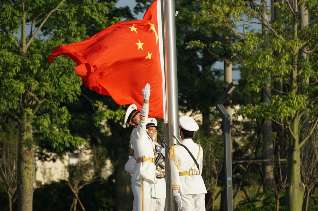 7時整,升旗儀式正式開始。國旗護衛隊員邁著整齊的步伐,護送五星紅旗入場。伴隨著慷慨激昂的《義勇軍進行曲》,旗手振臂一揮,五星紅旗冉冉升起,師生齊唱中華人民共和國國歌,向五星紅旗行注目禮。隨后,在丁永成的帶領下,全體黨員面向黨旗,重溫入黨誓詞,表達對黨的崇高信仰以及為黨的事業奮斗終生的堅定決心。