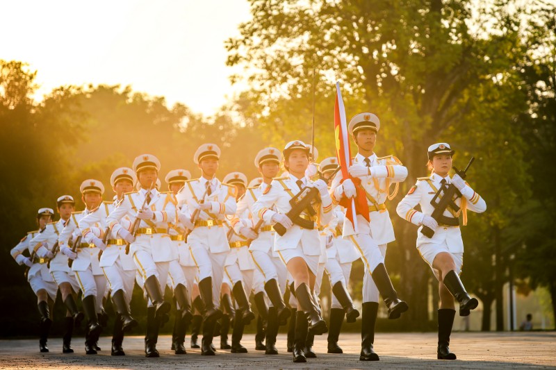 迎著初升的朝陽,國(guó)旗護(hù)衛(wèi)隊(duì)隊(duì)員邁著整齊的步伐護(hù)送國(guó)旗至升旗臺(tái)。現(xiàn)場(chǎng)奏唱國(guó)歌,五星紅旗伴隨著《義勇軍進(jìn)行曲》的音符在廣場(chǎng)上冉冉升起,在全體師生的注視下迎風(fēng)飄揚(yáng)。